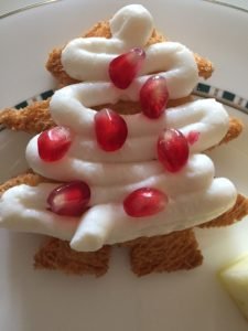 Lo primero es coger una rebanada de pan de molde y tostarlo. Una vez tostado, lo cortamos con el molde de hacer galletas de forma de árbol de Navidad. Después, le untamos el queso mascarpone y le añadimos unos granos de Granada.