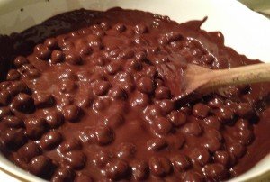 Al mismo tiempo, se pone al baño María los dos tipos de chocolate, se deja hasta que se deshace completamente.