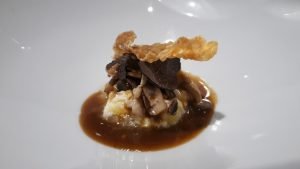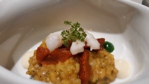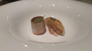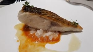 Después de los aperitivos, nos trajeron una sardina ahumada en una tosta que fue un gran comienzo, nos gustó mucho a todos. La crema de castaña con codorniz fue excepcional de una suavidad y cremosidad increíbles, pero el plato que me encantó fue el de setas de temporada con huevo roto y jugo de ave, una mezcla perfecta de sabores. El arroz cremoso, buenísimo y eso que no soy de erizos, sin embargo tengo que reconocer que no ocultaba el sabor del arroz, es más le daba un toque final contundente. La lubina, tiene mención aparte, la textura y sabor realmente mencionable. El conejo con crema de almendras el toque perfecto para acabar el pase y comenzar con los postres.