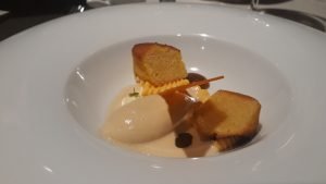 En algunos restaurante con cocina estrella Michelin «pinchan» en los postres ( a mí parecer) , en El Lago cuidan cada uno de ellos; el primero fue bueno el Financier de batata asada con sopa de leche merengada, miel de caña y sorbete de almendras… me transportó a mi infancia, con esos sabores de batata y leche merengada.