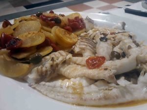 De segundo, yo ya casi ni podía seguir comiendo más, había preparado un lenguado con patatas, aceitunas, aderezado “A modo mio” o en español: “a mí manera” … así lo llamó Mauro, que fue el que se encargó de meter en el horno de leña semejante bandeja de pescado. Le dio su punto, tanto al pescado como a las patatas. Las imágenes y vídeo que adjunto dan testimonio.