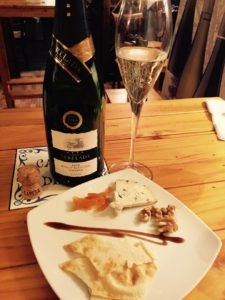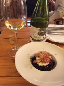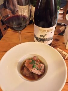 Continuamos con un Encina del Inglés tinto, que es la mezcla de la recuperación de variedades autóctonas como tempranillo, garnacha y Syrah, que maridados con un torrezno de pato, confit crujiente puerro y papel de arroz, fue una verdadera delicia. Envejecido durante 6 meses en tinas de 60 Hl de roble francés es un homenaje a los viajeros ingleses del Romanticismo (como su versión en blanco)