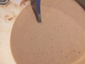 En otro bol, echamos la leche y los huevos y lo batimos bien.