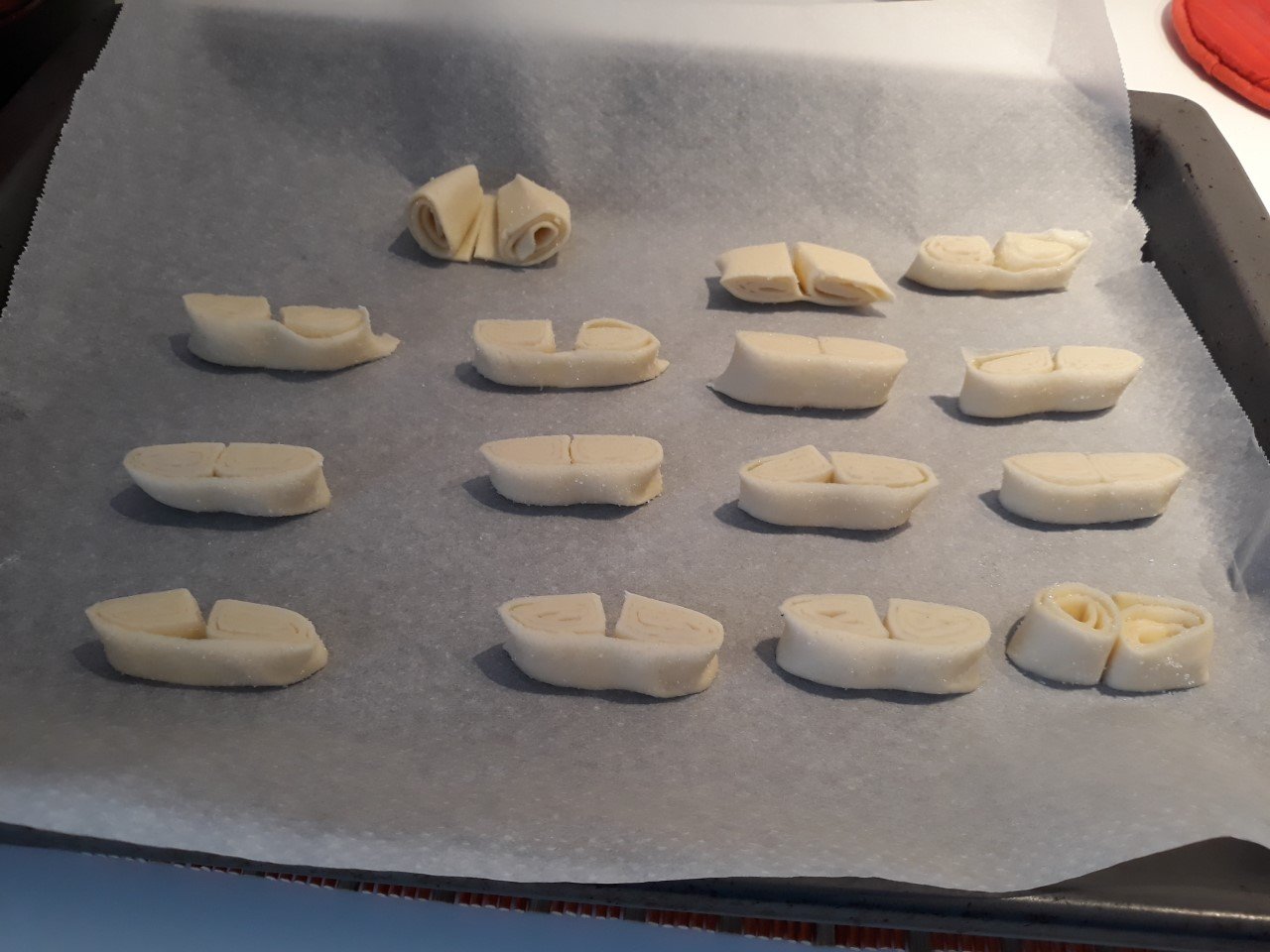 Despues cortamos con un cuchillo la masa, como si fuera una barra de pan, y las vamos poniendo en la bandeja.