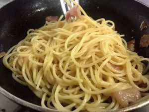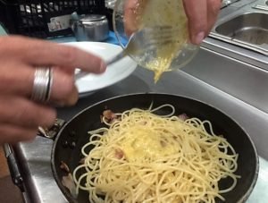 Mientras el agua hierve, troceamos la panceta y la ponemos en una sartén (sin aceite) le damos fuego vivo, hasta que veamos que la panceta está crujiente.  A su vez, en  un vaso pequeño o en un bol, metemos la yema de huevo y 2 pizcas de pimientas («con alegría», como diría Andrea)  y a continuación el queso parmesano, nosotros le pusimos dos cucharaditas de café bien colmadas… y removemos. Se bate bien y se reserva.
