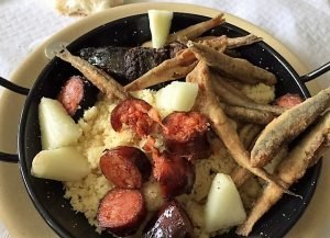 Después continuamos con los platos fuertes: las migas alpujarreñas hacían su aparición sobre la mesa. Se hacen con harina de sémola y en realidad no son «miga» de nada, de ahí su color blanco y textura suave. Además, de la morcilla y el chorizo, estas migas llevan melón y boquerones fritos. Como malagueña he de decir que me sorprendió muchísimo la mezcla, pero no puedo discutir el acierto de esta gran combinación. El melón, aligera el paladar y el boquerón te alivia después de un pedacito de morcilla o chorizo. Eso sí, capítulo aparte merece la morcilla que llevaba cebolla y estaba para chuparse los dedos
